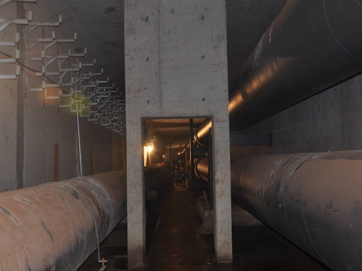 容納的管線(xiàn)較多,包括2根DN1000熱力管道、 1根DN1000給水管道、1根DN900給水管道、弱電管道、220KV、110KV、10KV電力管道及預(yù)留的中水管道、空調(diào)管、直飲水管道等。